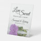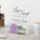 This pretty tabletop sign is perfect for a treat table at your wedding reception. It features a simple yet elegant design with a photo of a single long-stemmed lilac purple coloured rose reflecting in a pool of water with waves and ripples. The sign reads: Love is Sweet, please take a treat! There is room for your names and the wedding date below.