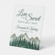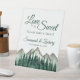 This tabletop sign is perfect for a treat table at your wedding reception. It features a simple yet elegant design with a rustic watercolor landscape with rugged mountain peaks and a pine tree forest. The sign reads: Love is Sweet, please take a treat! There is room for your names and the wedding date below.