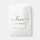 Chic white favour bags for your wedding favours featuring "Love Is Sweet" in simple typography and an elegant script with swashes, your names joined together by a heart and your wedding date.