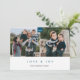 This modern 2 photo Christmas card features a clean white background with two square photos. Simple text, "LOVE & JOY" appears in dark blue. Custom text allows you to add your family name. The backside offers the same dark blue background with a white geometric pattern. Photography © Storytree Studios, Stanford, CA