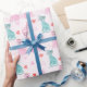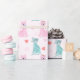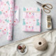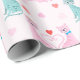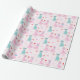 An illustration of adorable pink and green kitties frolicking among a scattering of red and pink hearts on a pastel pink background