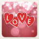 Romantic illustration featuring hanging red hearts with "LOVE" letters on a bokeh background.