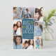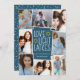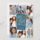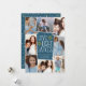 Fun and festive Hanukkah photo card features eight photos arranged in a collage layout. "Love, light, latkes" appears in the centre in white lettering on a dark blue background accented with stars. Personalise with your names and the year.