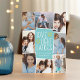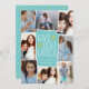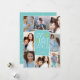 Fun and festive Hanukkah photo card features eight photos arranged in a collage layout. "Love, light, latkes" appears in the centre in white lettering on a bright turquoise blue background accented with stars. Personalise with your names and the year.