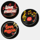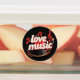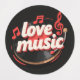 A bold and energetic illustration centred around a vinyl record with the phrase “love music” emblazoned in large, white, slightly shadowed letters. Red musical notes and a treble clef swirl around the text, adding rhythm and movement to the design. The record’s grooves and stylus arm evoke classic analogue sound, celebrating a deep passion for music. The black background enhances the contrast and makes the red and white elements pop, creating a visually striking tribute to musical expression.