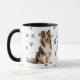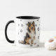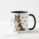 This mug for the Shetland Sheepdog owner features a beautiful portrait of a sitting Sheltie. The image is printed twice, and between them is an oval with the black text that says "Love my Shetland Sheepdog". The oval and dog images are placed on a white background sprinkled with paw prints. Your monogram or name can be placed in a text field at the bottom.