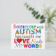 Inspirational Autism quote of “Someone With AUTISM has taught me LOVE Needs NO WORDS” with colourful words and Autism puzzles to support autistic children and their families.