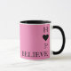 Modern, stylish pink and black LOVE HOPE BELIEVE Personalised Mug with the words HOPE and BELIEVE on the front, plus an extract from 1 Corinthians 13:7-8 - LOVE NEVER FAILS on the back. On the front, the O in HOPE is replaced by a heart. On the back, the O in LOVE is replaced by a heart, and there is CUSTOMIZABLE Scripture from 1 Corinthians 13:7-8 followed by a PLACEHOLDER NAME. You can replace this with your preferred Bible version plus your name. An ideal gift for Valentines, Birthdays and Christmas. Colour scheme is PINK typography on a modern BLUE GRAY background. Other colours available.