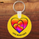 This is a vibrant yellow LOVE NEVER FAILS Colourful Hearts keychain, designed with three multicolored hearts with black outlines, one heart inside the other, set against the bright yellow background. Underneath the text reads LOVE NEVER FAILS, which is based on the Christian Bible verse in 1 Corinthians 13. This text is CUSTOMIZABLE, so you can add your name or create your own text here. Choose from a wide selection of hearts and Christian designs by Berean Designs. This would make a great gift for Valentine's, Christmas and birthdays. This hearts keychain would also be a great gift for couples and anniversaries.