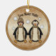 Adorable country style penguin couple with snow falling and the words "Love Never Melts". Personalise on the back with your names and the year.