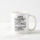 This image is a humourous take on a nutrition label, with the word "LOVE" at the top. It lists various aspects of love as if they were nutritional values.