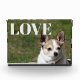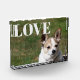 This modern photo block features the word LOVE in the upper right corner. The typography is all capital letters and is in white. Insert the photo of your choice. This makes a great gift for grandparents, teens or anyone who loves somebody. The frameless design of this photo block means it will look good with any decor. What to get the person who has everything? A photo block with a picture of someone they LOVE.