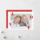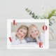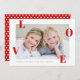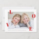 A simple, classic photo valentine's day card with staggered red love on a clean, modern white background. The accompanying pattern backer has a repeating heart pattern in red and white. Valentine's day cards are the perfect way to send love and make up for missing the holiday rush of christmas and new years cards. It's sometimes hard to get it all done and things have usually slowed down by Valentine's day and you can plan sending out cards a little easier. It's unexpected when they show up in the mail making them extra special. Plus they don't have all those holiday cards to compete with so they really stand out.