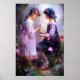 An AI-generated painting of two girls admiring a flower. Perfect for a nursery or girl's bedroom.