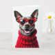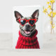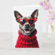 This charming card features a small gray pup, chihuahua-like in appearance, front and center against a bright white background. Its oversized ears and cheerful expression immediately draw attention. The dog wears a bold ruby-red turtleneck sweater that contrasts beautifully with its soft gray fur, adding warmth and personality to the scene. Heart-shaped sunglasses rest on its nose, tinted a cool blue that adds a fun, eye-catching detail.