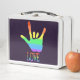 Pretty rainbow hand in the sign language word for love, is over the word LOVE that is written in rainbow colours, on custom lunch boxes. The background colour of dark purple can be customised to any colour of your selection. Thank you for shopping at CherylsArt on Zazzle.
