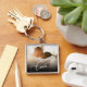 This keychain features the word love in an elegant, stylish script over a custom photo. This design features a single photo of a bride and groom — the perfect wedding gift for newlyweds.