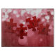 4 red puzzle pieces with the lettering "LOVE" on a bokeh background.