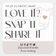 Modern "love it snap it share it" square sticker in taupe and white with space for your business name and social media links. This personalised 'tag us' label includes social media icons for instagram, facebook, tiktok, pinterest and twitter, as well as space to add your custom hashtag. The modern serif fonts with swirls add extra elegance to this "follow us" business sticker. The perfect way to encourage customers to tag you online and help grow your small business.