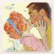 Artist:Bernard D'Andrea | Red-haired lady kissing man behind sunflowers with a blue chair and a cat.