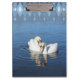 This clipboard features a photograph of a pair of mute swans on a bright blue lake.