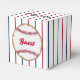 Love and Thanks, Baseball Cookie-GUEST FAVOR BOX-An allover red, white and blue pinstripes background covers the entire box. On the back side is an iced red and white baseball cookie with iced text that reads: Guest. The cookie can stay or be removed by you. On the top is a decorative word art text embellishment with a small red heart. The text image on top reads: Love and Thanks with a red heart embellishment. The background pinstripes cover the entire box. This design is suitable for any baseball themed party event. The design is available with a blue and white iced cookie or a red and white iced cookie. Coordinating baseball themed party supplies is available.