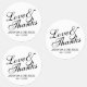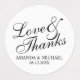 featuring title "Love & Thanks" in black elegant script font style with bride and groom's name and wedding date in black classic serif font style on white background.