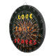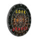 The artwork features a centred and balanced layout that draws the viewer's eye to the central motif, combining text and imagery for a striking effect. The dark background enhances the vibrancy of the colours, making the design pop.