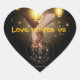 Heart-shaped sticker with two hands strung together and the word love unites us.