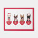 Illustration of three French Bulldog puppies of different colours popping out of hearts dressed in Valentine's Day attire.