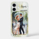 Phone case featuring your custom photo on a green gold boho chic abstract design with script texts. Beautiful as a gift for a bride or an engagement gift.