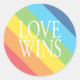 This modern and colourful design celebrate the new marriage equality law. It features a background with lines in the colours of the rainbow and the words "Love Wins" in white letters. This stylish design celebrate love and marriage for both straight and gay people.