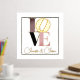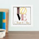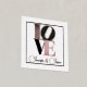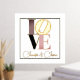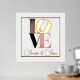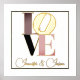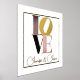 Romantic foil print, with The word LOVE done in gold, pink, black and taupe, set on a white background, with a thin gold frame around the outside edge. Personalise the gold text, across the bottom, to read what ever you wish.