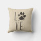 A pillow with a cute illustration of a sketched dog paw print in brown with a grunge style. The letters spell out the word "Love" with the paw print in place of the letter "o". Awesome for pet lovers.