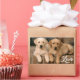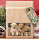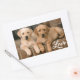Love is in the air! This cute sticker features a pair of yellow Labrador Retriever puppy dogs resting on a red brick fireplace hearth with the word love printed in a fancy white script font.