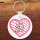 Round button keychain features a pink stripe heart and fun text "Love You A Latte." Keychains make memorable gifts for family and friends or create for yourself.