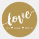 Trendy elegant round sticker featuring a prominent script spelling "LOVE" on a richly coloured background. Perfect for Valentine's Day, Sweetest Day, wedding, anniversary, or any day!