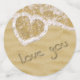 "Love you" letters handwritten in the sand next to heart-shaped water bubbles.