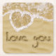 "Love you" letters handwritten in the sand next to heart-shaped water bubbles.