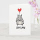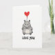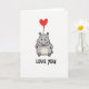 This Valentine’s Day card features a cute gray cartoon hippo set against a white background. The hippo holds a red heart-shaped balloon on a thin black string, which floats just above its head and draws the eye right away. With small dot eyes, a wide smile, and two tiny front teeth showing, the hippo looks cheerful and sweet. Simple black outlines define its round body and face, keeping the focus on the character and the heart. Near the bottom, the words “LOVE YOU” appear in black handwritten-style lettering, centered and easy to read. The open space around the design gives it a calm, sincere feel, making it a thoughtful choice for sharing affection with a partner, friend, or crush on Valentine’s Day.