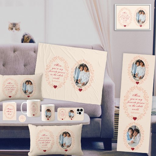 Vintage, elegant and chic style with double floral frame with a sentimental quote for mum on one side and on the other side ready to personalise with your own photo of mum. Red calligraphy highlighting the special dedication for mum, on a soft pastel background and two cute little hearts at the bottom of the frames. The best unique keepsake for Mother's Day.