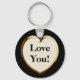 "Love You!," text on a pretty heart with gold borders and a contrasting black background. Nice for weddings, silver 25th anniversaries, for your sweetheart, girlfriend or boyfriend on Valentine's Day, for Mum for Mother's Day, and birthday gifts, etc. A lovely, fun and elegant stylish keychain and a unique, personal gift for that someone special.