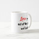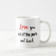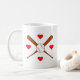 A baseball fan's mug for Valentine's day or any romantic occasion. On one side, the text is "Love you out of the park and back". On the other is a design of crossed baseball bats and a baseball, with four red hearts.