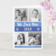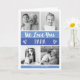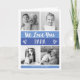 This trendy and stylish greeting card features four photos of you and your grandfather, with modern colour blocks in two shades of blue, with white handwritten script typography and cute scribbled hearts. The card says "we love you grandpa," and there is a spot to add your names and a message inside.