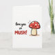 This card is simple but full of warmth and affection. On the right side, there's a cute mushroom character with a bright red cap and soft white spots, set against a white background. It's *Amanita muscaria*, and its smile and eyes radiate pure delight. The mushroom's stem is a soft beige, grounding the whimsical design.