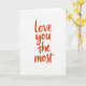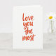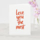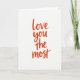 This card shows the words “love you the most” painted in an orange-red color that feels warm and romantic ❤️. The letters look like they were brushed on by hand, with thick and thin strokes and a little roughness at the edges. The phrase is stacked in a vertical layout down the middle, so your eyes go straight to the message. The background is plain white with lots of open space around the words, which makes the text stand out even more. The lettering has a casual, flowing look, like a note you’d write when you really mean it. It’s a simple design, but it still feels close and sincere, making it great for a partner or someone you care about 🥰. Giving this card is an easy way to say “you matter to me” without needing a long note. Hope it helps you share a little extra love on Valentine’s Day.