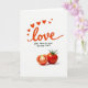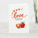 This Valentine’s Day card features a white background with the word “love” written large across the top in orange-red cursive script. Around the word are small red hearts scattered like confetti, adding a sweet, romantic touch ❤️. Just below, the card reads “YOU FROM MY HEAD TO-MA-TOES” in dark green, handwritten-style letters that feel friendly and funny. The bottom half shows two red tomatoes on a simple surface, lit softly with gentle shadows underneath. One tomato is whole with a green stem on top, and the other is cut in half, showing yellowish seeds and juicy red sections inside. The tomatoes look fresh and glossy, and the cut one hints at sharing what’s in your heart