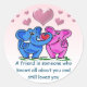 Pink hearts float above pink and blue elephants who love each other with the message "A friend is someone who knows all about you and still loves you"