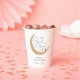 Loved to the Moon and Back baby shower paper cups. Design features faux sparkly gold moon with "You are loved to the moon and back" in a cute calligraphy text. Personalise with your information or click "Click to customise further" to edit font styles, size and colours.