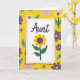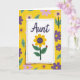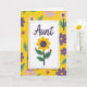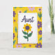 This greeting card features a slightly tilted white panel set over a bright yellow background filled with repeating flowers and leaves. A dashed purple border frames the panel, giving it a cozy, friendly look that feels like a note meant for someone close ❤️. Near the top of the panel, the word “Aunt” appears in dark indigo lettering, centered and easy to spot. Beneath it sits a large yellow flower with wide petals and a deep purple center, like a sunny bloom leaning in for a gentle hug. Two green leaves stretch out from the stem, and each leaf holds a tiny red insect with black spots, like little companions sharing the moment 🌼. Behind the panel, the garden pattern continues in lighter lavender and deeper purple blossoms mixed with bright green leaves, filling the space with a soft, affectionate energy. The yellow background stays dominant, making the white panel and indigo word stand out clearly. The purple dashed outline, the centered “Aunt” text, and the sunflower-like bloom sit neatly on the white panel against the yellow floral field.